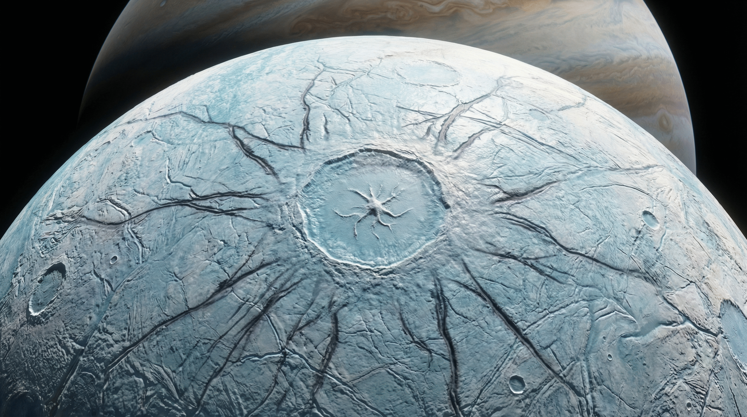 Europa, uma das luas mais fascinantes de Júpiter, guarda um oceano de água líquida sob sua crosta gelada. Por isso, ela é um dos lugares mais promissores para se buscar vida fora da Terra. Em sua superfície, porém, há uma formação que há anos intriga os cientistas: uma mancha escura com braços que se espalham como uma aranha, bem no centro de uma grande cratera.