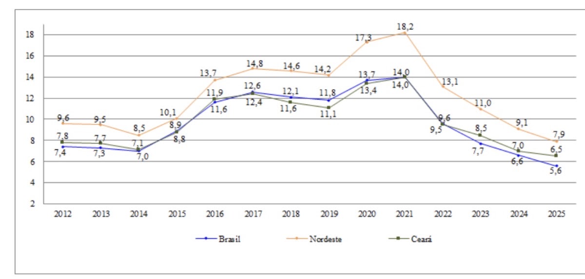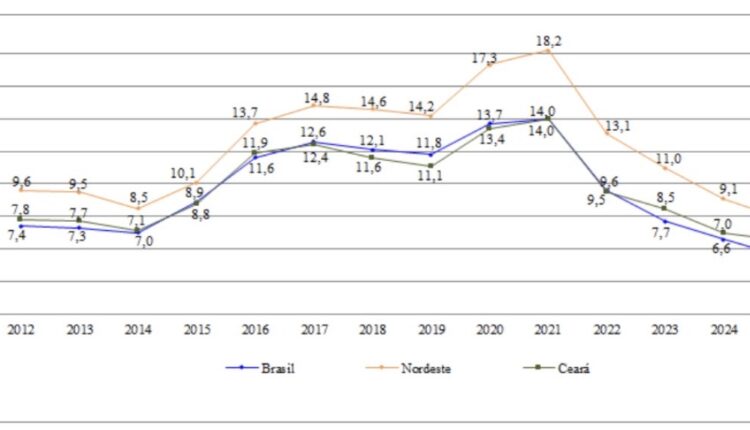 O dado atual coloca o Ceará em uma posição de destaque na região Nordeste. Enquanto a média do estado é de 6,5%, a taxa para todo o Nordeste ficou em 7,9%. A diferença mostra uma performance econômica estadual acima da média regional, um sinal muito positivo.