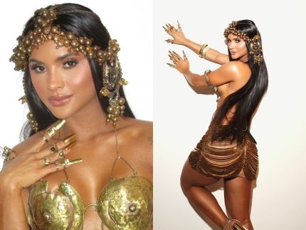 Por trás de uma fantasia assim, existe um grande trabalho em equipe. A saia foi desenvolvida pelo estilista Márcio Ferreira. Já o top e as unhas metálicas foram criação do designer de joias Caio Motta. O adereço de cabeça, também em metal dourado, foi feito por Ramon Cabeças, com a direção de estilo de Lucas Andrade. É um processo que envolve muitos profissionais talentosos.