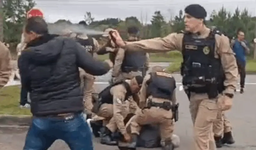 As imagens que circulam mostram policiais aplicando o spray diretamente no rosto de pessoas, inclusive mulheres. Em outro momento, um homem de 60 anos é imobilizado com uma mata-leão e algemado pelas costas enquanto estava no chão. Ele não oferecia resistência à prisão, conforme registrado nos vídeos.